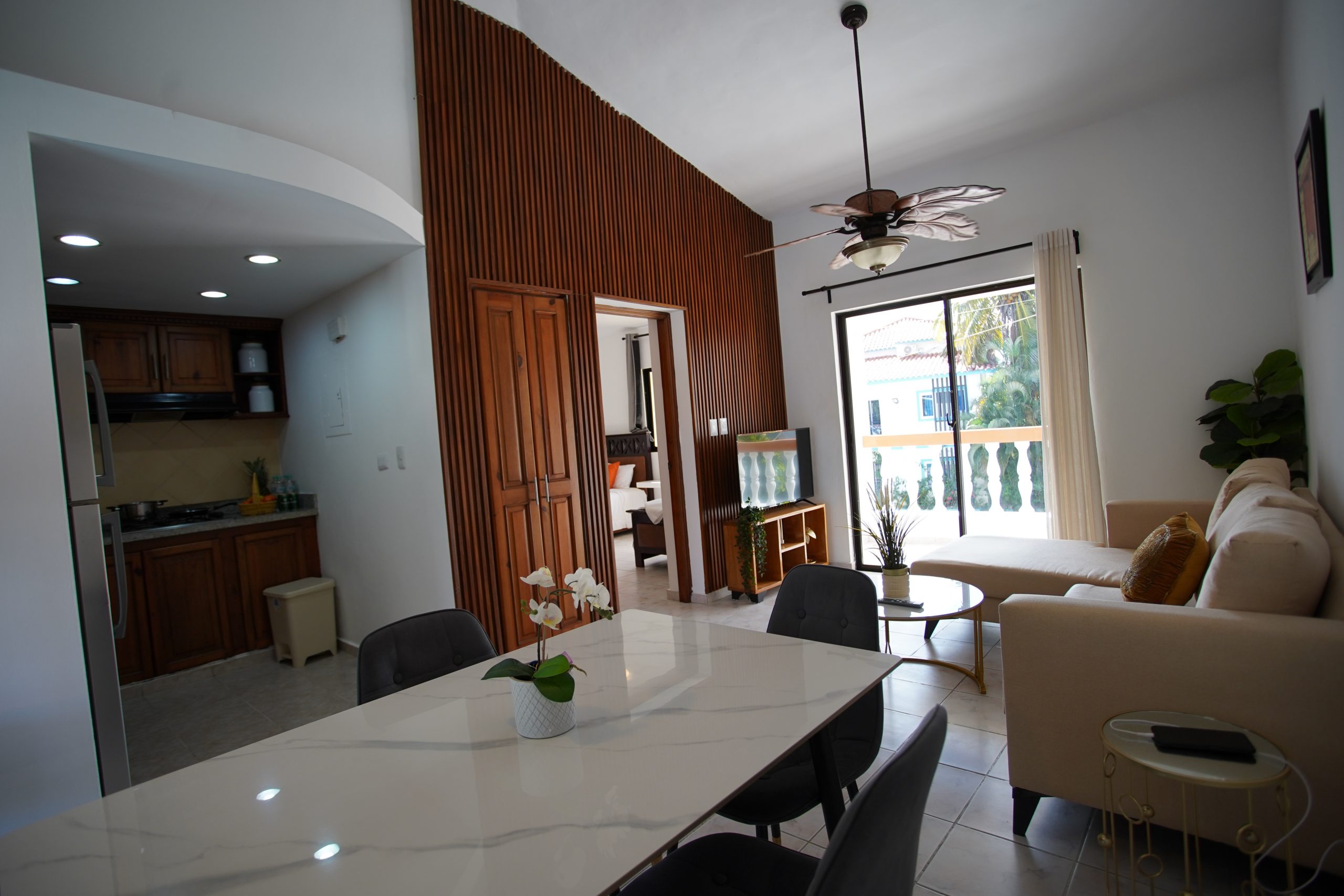 Bienvenido a tu oasis en Bávaro. Esta luminosa y moderna suite ha sido diseñada pensando en tu máximo confort y descanso. Disfruta de un espacio íntimo donde la brisa tropical se mezcla con un diseño interior elegante y funcional. Relájate en la cama King size después de un día de playa, prepara un desayuno caribeño en la cocina totalmente equipada o disfruta del atardecer desde tu balcón privado. El entorno perfecto para una escapada romántica o un viaje de relax inolvidable.